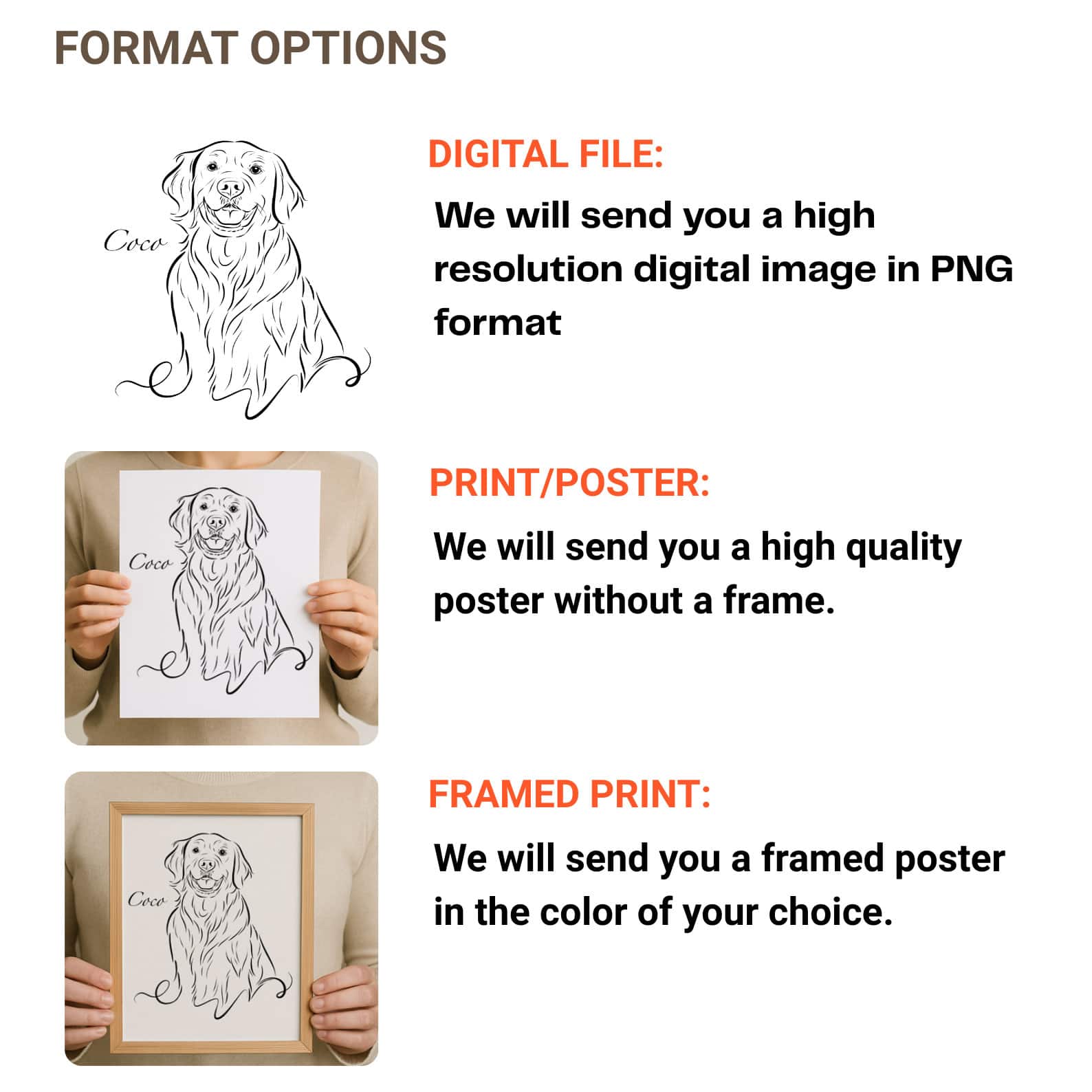 Select whether you’d like a digital file only, or a printed and framed piece delivered to your door.
